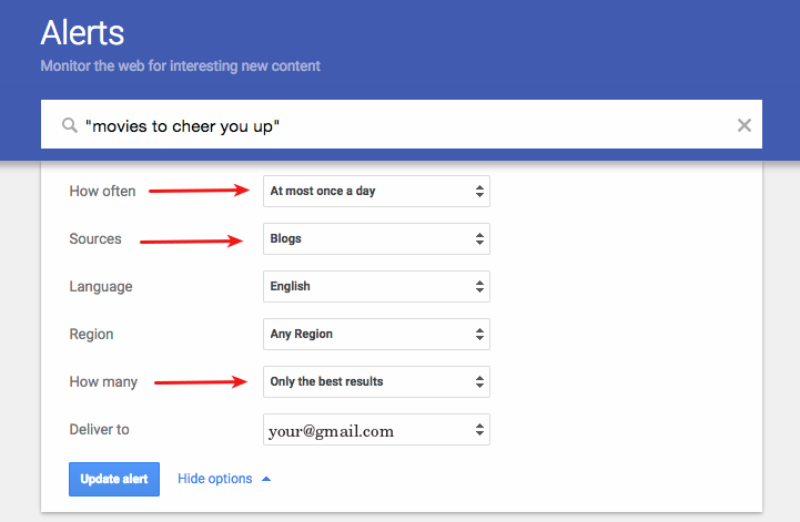 Setting the google alert isn’t complicated: in the ‘search query’ field type in a couple of words related to one of your best posts. Set ‘results type’ to Blogs and choose the frequency of the report in the ‘how often box’: make it once a day or even ‘as it happens’. In the ‘How many’ option choose ‘only the best results’ which gets you a list of relevant posts only from popular blogs.